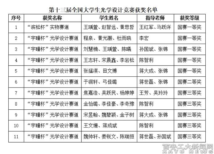 (本网讯)近日,第十三届全国大学生光电设计竞赛在杭州市落下帷幕,我校11支队伍进入全国总决赛,获得一等奖5项、二等奖1项、三等奖5项。西安工业大学荣获“优秀组织单位”奖,我校教师李宏、孙国斌、张锦、陈智利、王红军、马跃洋和蒋大成荣获“优秀指导教师奖”。第十三届全国大学生光电设计竞赛全国总决赛在浙江大学举行。本项赛事由中国光学学会主办、全国大学生光电设计竞赛委员会负责、浙江大学承办,是我国高校光电类专...