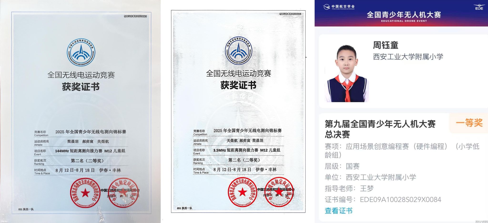 在黑龙江伊春市举行的2025年全国青少年无线电测向锦标赛上,我校附属小学的6名学生作为陕西省代表队成员参加了全部5个项目的角逐。郝弈宸、简晨羽分别获得3.5MHZ、144MHZ短距离接力赛M12组两项第二名。
