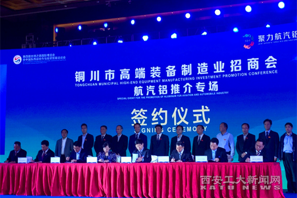 (本网讯)5月11日,在西安召开第四届丝博会期间,铜川市委、市政府举办了以“聚力航汽铝 迈向中高端”为主题的“高端装备制造业——航汽铝专场推介会”。在铜川市经济转型发展中,为着力打造航汽铝高端装备制造业,建设高质量的现代工业产业体系,根据铜川市的产业布局、资源优势及发展愿景,铜川市与陕西省汽车工程学会、陕西重型汽车有限公司等陕西省大型国有企业,联合长安大学、西安工业大学、西安建筑科技大学的技术优势,共同成立“陕西(铜川)汽车轻量化材料制造创新中心”,旨在充分发挥各自优势,助力实现“陕西制造、铜川配套”。校长雷亚萍代表学校出席了签约仪式。