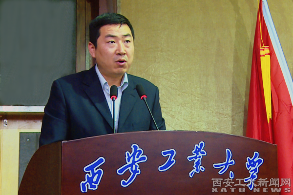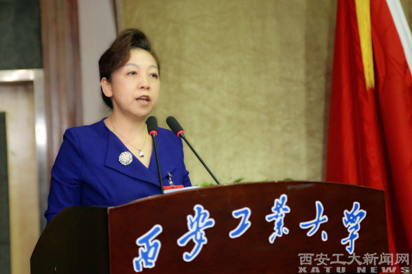 陕西省教科文卫体工会副主席陈鹏致辞。陈鹏指出,双代会是学校发展中的大事,是全校教职工政治生活中的喜事。近几年来,西安工业大学工会在民主管理、民主监督、维护教职工合法权益、丰富教职工文化生活等方面成绩显著,希望学校党委一如既往地支持工会工作。对于今后工会工作,陈鹏提出了意见和建议。
