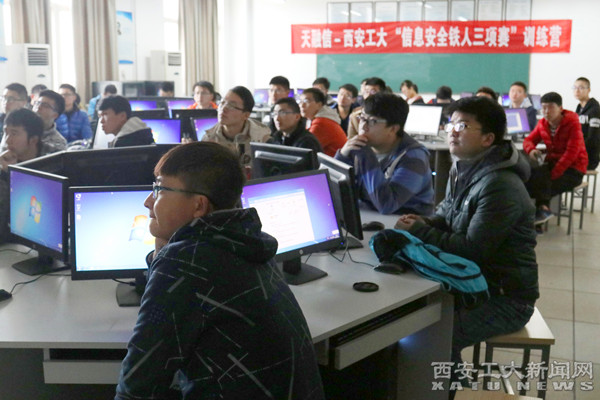 (本网讯)近日,西安工大——天融信“信息安全铁人三项赛”训练营第一期培训在我校未央校区举行,天融信铁人三项赛训练营指导教师苗春羽,我校计算机学院教师、网络空间安全协会成员参加。
