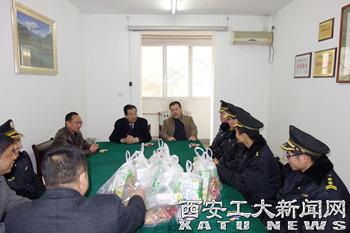 (本网讯)2月18日,我校在未央校区举办新春师生茶话会,校党委副书记丁养斌、学生工作部(处)长李建安及保卫处相关人员慰问寒假期间勤工助学学生,与假期留校的爱校卫士学生一起欢度羊年除夕,