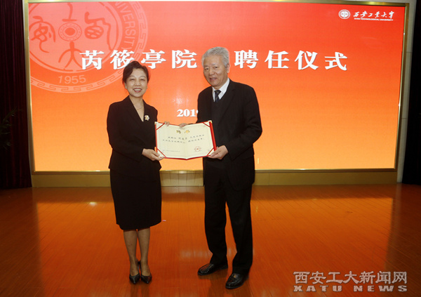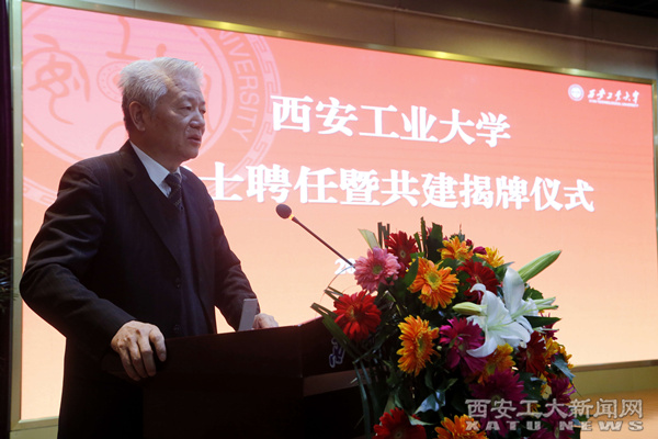 西安工业大学校长雷亚萍为芮筱亭院士颁发了聘书,芮筱亭院士向中国兵器工业集团西北兵工局和学校赠书。中国兵器工业集团西北兵工局和我校签署共建协议,并举行了揭牌仪式。