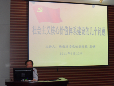 (本网讯)为了庆祝中国共产党建党90周年,落实西安工业大学宣传部制定的“九个一”活动计划,西安工大雁塔校区在开展“中国共产党党史”系列讲座的同时,邀请了陕西省委党校副校长高峰,为校区的学生党员、入党积极分子共200余人,做了《社会主义核心价值体系的几个问题》的专题讲座。