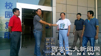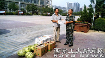 (本网讯)今年暑期以来西安的气温就一直居高不下,校工会代表学校慰问了高温下仍然坚持在一线工作的基建处职工和参加大学新生军训的教师,为他们送去了清凉。校工会副主席朱晋中对他们的无私奉献和敬业精神表示敬意,代表学校全体教职工对他们的辛勤工作表示慰问和感谢。