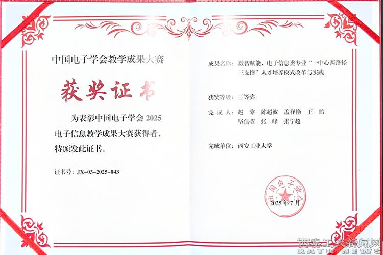 (本网讯)7月26日,中国电子学会2025年电子信息教学成果大赛在成都举行颁奖典礼,我校电子信息工程学院提出的“数智赋能,电子信息类专业‘一中心两路径三支撑’人才培养模式改革与实践”成果荣获教学成果大赛三等奖。