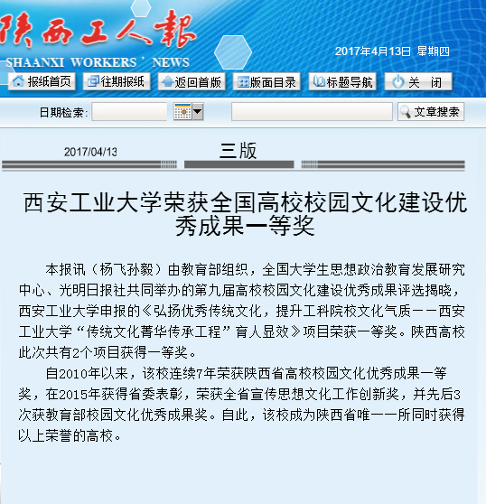 本报讯(杨飞孙毅)由教育部组织,全国大学生思想政治教育发展研究中心、光明日报社共同举办的第九届高校校园文化建设优秀成果评选揭晓,西安工业大学申报的《弘扬优秀传统文化,提升工科院校文化气质——西安工业大学“传统文化菁华传承工程”育人显效》项目荣获一等奖。陕西高校此次共有2个项目获得一等奖。