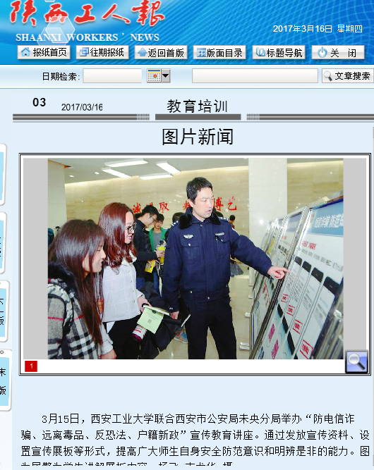 3月15日,西安工业大学联合西安市公安局未央分局举办“防电信诈骗、远离毒品、反恐法、户籍新政”宣传教育讲座。通过发放宣传资料、设置宣传展板等形式,提高广大师生自身安全防范意识和明辨是非的能力。图为民警为学生讲解展板内容。杨飞 支龙华