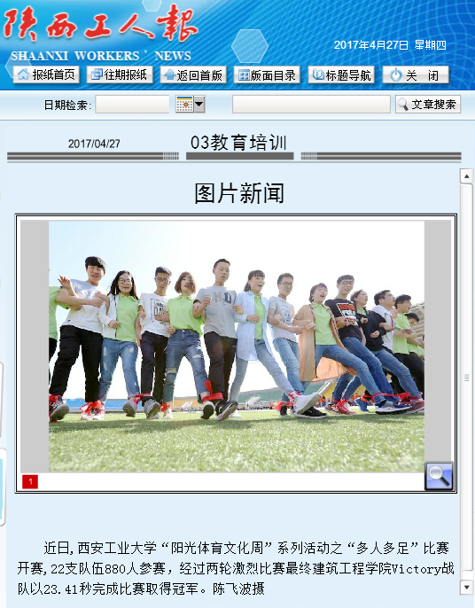 近日,西安工业大学“阳光体育文化周”系列活动之“多人多足”比赛开赛,22支队伍880人参赛,经过两轮激烈比赛最终建筑工程学院Victory战队以23.41秒完成比赛取得冠军。