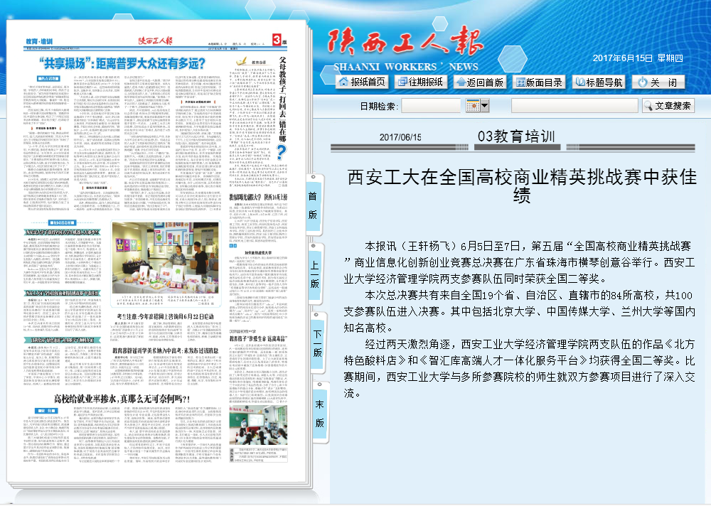 本报讯(王轩杨飞)6月5日至7日,第五届“全国高校商业精英挑战赛”商业信息化创新创业竞赛总决赛在广东省珠海市横琴创意谷举行。西安工业大学经济管理学院两支参赛队伍同时荣获全国二等奖。