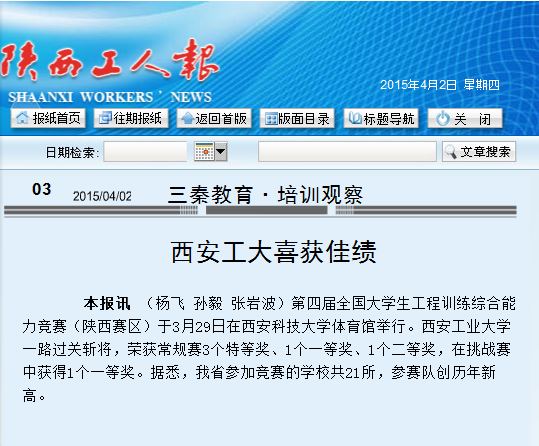 本报讯 (杨飞 孙毅 张岩波)第四届全国大学生工程训练综合能力竞赛(陕西赛区)于3月29日在西安科技大学体育馆举行。西安工业大学一路过关斩将,荣获常规赛3个特等奖、1个一等奖、1个二等奖,在挑战赛中获得1个一等奖。据悉,我省参加竞赛的学校共21所,参赛队创历年新高。